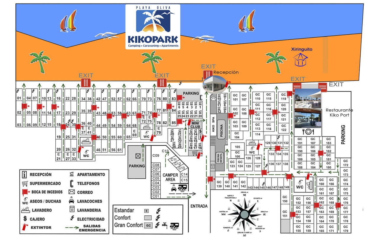 Camping KIKO PARK OLIVA BEACH liegt zwischen dem blauen Meer und satten Grn der Bume am Strand in Oliva Valencia gelegen. P en lugn gata i en trevlig spansk by mellan Valencia och Alicante ligger campingen Camping Kiko Park bredvid den lokala marinan och precis vid en vacker strand. Alle Einrichtungen sind das ganze Jahr dank dem milden Klima der Gegend.